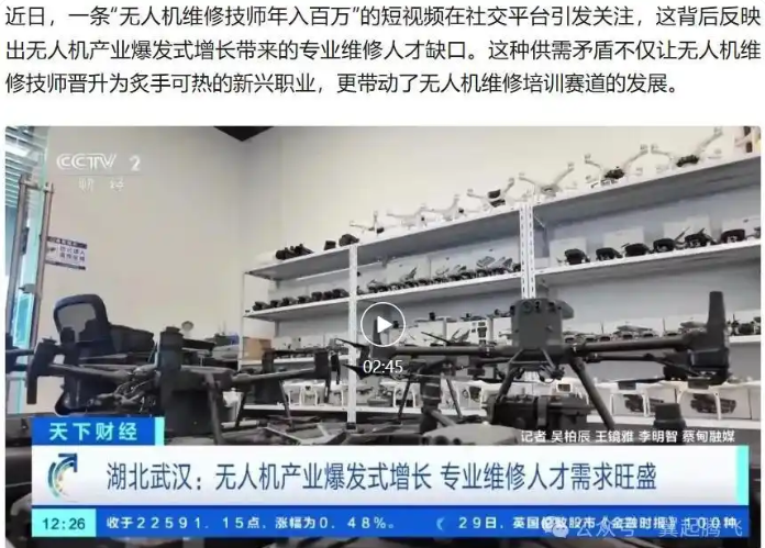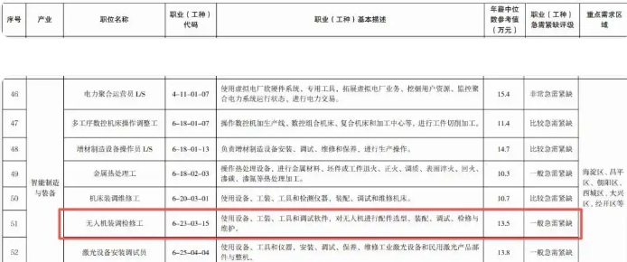 随着低空经济的蓬勃发展,无人机作为重要载体,应用场景持续拓宽——从物流配送、飞行表演,到应急救援、工业巡检,再到农业植保、城市管理,其市场需求正以惊人速度攀升。 数据显示,今年1至8月,我国民用无人机产量同比增长53.7%,保有量的持续增加直接推高了无人机规划、维护、检修及维修等相关需求,也让无人机领域成为当下极具潜力的就业新赛道。 在此背景下,一些无人机相关职业从过去的 “冷门技能” 一跃成为 “就业新宠”。 01 近日,央视财经发文,无人机产业爆发式增长带来专业维修人才缺口,无人机维修技师成为炙手可热的新兴职业,最高年薪可达百万,目前急缺人! 数据显示,今年1至8月,我国民用无人机产量同比增长53.7%,无人机保有量的持续攀升直接推高了维修需求。 据央视报道,新手月薪在5000元到8000元,一些资深的技术维修工程师年薪是20万元到30万元。 针对网传“年入百万”的说法,某基地负责人坦言这属于行业顶尖水平,但职业成长空间确实可观。 02 此前,北京市人力资源和社会保障局发布《北京市新质生产力人力资源开发目录(2025年版)》,无人机群飞行规划员和无人机装调检修工,被评为“急需紧缺”职业。 从上表中可以看到,无人机群飞行规划员的年薪中位数约为17.6万元,无人机装调检修工的年薪中位数约为13.5万元。 当前大量无人机的使用必然带来大量的规划、维护和检修、维修需求,但是目前无人机装调、维修专业技术人员不多,所以这些无人机相关人才缺口就出现了。 03 更值得关注的是,当前无人机领域存在巨大的 “人才供需差”:截至2024年,全国无人机操控员执照颁发量达27.33万本(其中有效执照 24.73 万本),但行业人才缺口超100万。这种不平衡意味着,无论是无人机飞手、维修、装调,还是飞行规划,都存在大量待填补的就业机会。 无人机行业正以 “飞起来” 的加速度,为越来越多的年轻人打开职业生涯的全新维度。低空经济的蓬勃潜力、行业的广阔前景,以及人才缺口带来的机遇,共同指向一个结论:当下正是投身无人机行业的好时机。 |